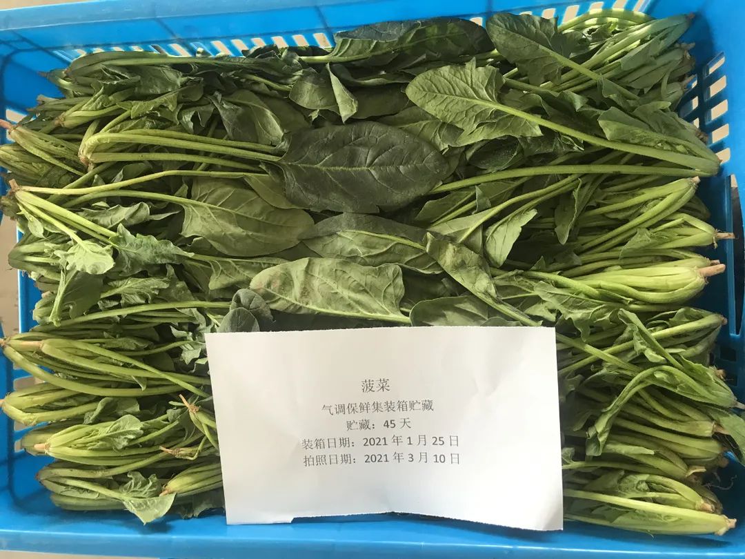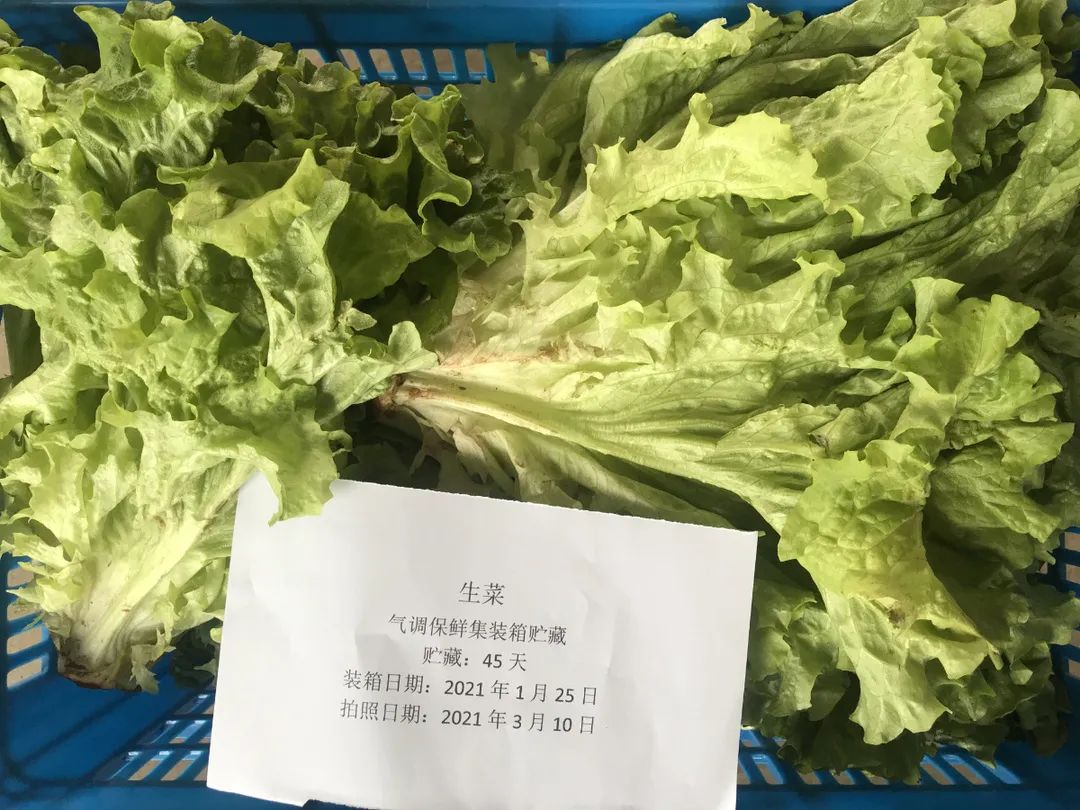 在廠內(nèi)進行技術研發(fā)固然重要,在實踐中跟蹤驗證才能將裝備性能落實好。在廠內(nèi)完成保鮮試驗后,氣調(diào)冷藏集裝箱又馬不停蹄趕往山東壽光開展蔬菜基地陸用保鮮試驗,在北方寒冬季節(jié)里,測試設備的應用工況,并作為氣調(diào)冷藏集裝箱走向大棚蔬菜保鮮的一次前期基礎性工作,全程跟蹤設備運行及試驗情況。2021年1月25日~3月11日,在貯藏45天后,除西蘭花、花椰菜、小白菜外,生菜、菠菜、油麥菜、上海青4種菜品,幾乎仍保持著剛入庫時的新鮮狀態(tài),失重率及折損率均不大于10%及15%。能達到此保鮮效果,也與基地果蔬好的品種與品質(zhì)有關。